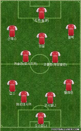 오스피나 · 코시엘니 · 메르테사커 · 깁스 · 벨레린 · 코클랭(체임벌린) · 카솔라(로시츠키) · 외질 · 산체스 · 웰백 · 지루(월콧)