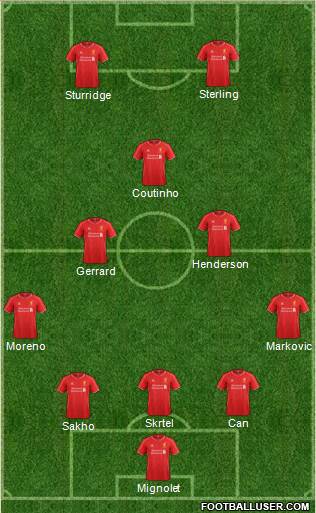Mignolet · Sakho · Skrtel · Can · Moreno · Markovic · Gerrard · Henderson · Coutinho · Sturridge · Sterling