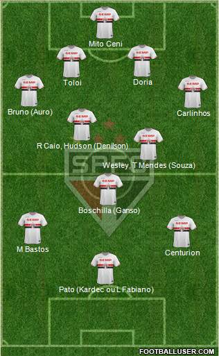 Mito Ceni · Doria · Toloi · Bruno (Auro) · Carlinhos · R Caio · Hudson (Denilson) · Wesley · T Mendes (Souza) · Boschilla (Ganso) · M Bastos · Centurion · Pato (Kardec ou L Fabiano)