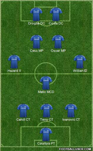 Courtois PT · Cahill CT · Terry CT · Ivanovic CT · Matic MCD · Hazard II · Willian ID · Cesc MP · Oscar MP · Drogba DC · Costa DC