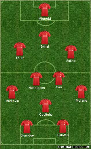 Sturridge · Balotelli · Coutinho · Markovic · Moreno · Henderson · Can · Sakho · Toure · Skrtel · Mignolet