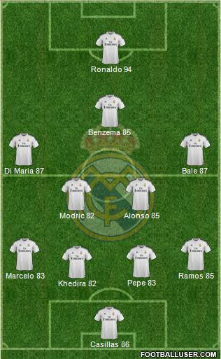 Casillas 86 · Khedira 82 · Pepe 83 · Marcelo 83 · Ramos 85 · Modric 82 · Alonso 85 · Di Maria 87 · Bale 87 · Benzema 85 · Ronaldo 94