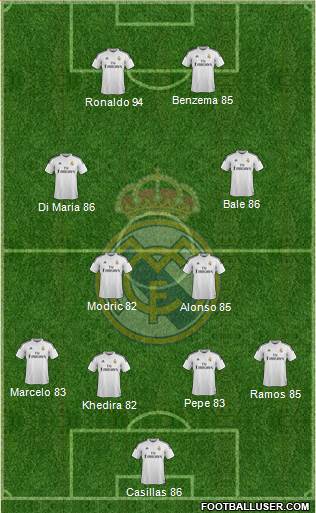 Casillas 86 · Khedira 82 · Pepe 83 · Ramos 85 · Marcelo 83 · Alonso 85 · Modric 82 · Di Maria 86 · Bale 86 · Ronaldo 94 · Benzema 85