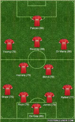 De Gea (85) · Jones (79) · Rojo (79) · Rafael (77) · Shaw (75) · Blind (79) · Herrera (79) · Young (78) · Di Maria (86) · Rooney (86) · Falcao (86)
