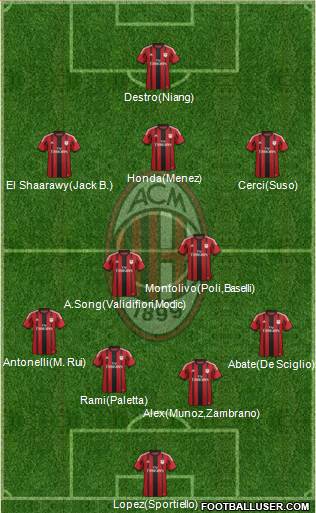 Lopez(Sportiello) · Alex(Munoz · Zambrano) · Rami(Paletta) · Abate(De Sciglio) · Antonelli(M. Rui) · A.Song(Validifiori · Modic) · Montolivo(Poli · Baselli) · El Shaarawy(Jack B.) · Cerci(Suso) · Honda(Menez) · Destro(Niang)
