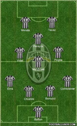 Buffon · Chiellini · Bonucci · Evra · Lichtsteiner · Marchisio · Vidal · Pogba · Pereyra · Morata · Tevez