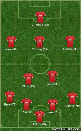 De Gea (84) · Jones (81) · Rojo (80) · Danilo (79) · Shaw (77) · Blind (79) · Pjanic (83) · Nani (82) · Rooney (85) · Di Maria (86) · v. Persie (89)