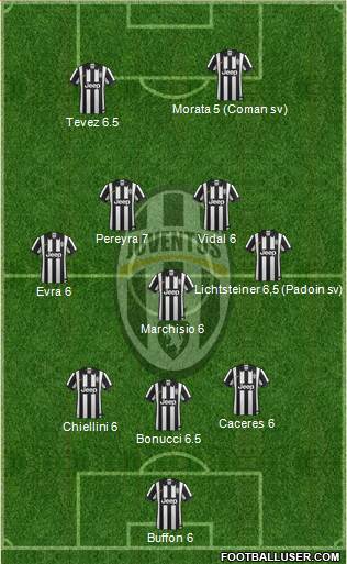 Buffon 6 · Bonucci 6.5 · Chiellini 6 · Caceres 6 · Marchisio 6 · Evra 6 · Lichtsteiner 6 · 5 (Padoin sv) · Pereyra 7 · Vidal 6 · Tevez 6.5 · Morata 5 (Coman sv)