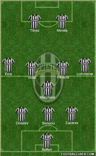 Buffon · Chiellini · Bonucci · Caceres · Marchisio · Vidal · Pereyra · Evra · Lichsteiner · Tévez · Morata