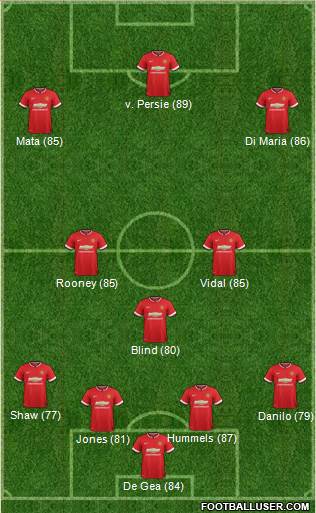 De Gea (84) · Jones (81) · Hummels (87) · Danilo (79) · Shaw (77) · Blind (80) · Rooney (85) · Vidal (85) · Mata (85) · Di Maria (86) · v. Persie (89)
