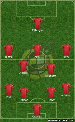 Casillas · Ramos · Piqué · Alba · Arbeloa · Busquets · Alonso · Iniesta · Xavi · Silva · Fàbregas