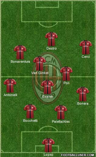 Lopez · Paletta/Alex · Bocchetti · Bonera · Essien · Antonelli · Poli · Van Ginkel · Bonaventura · Cerci · Destro