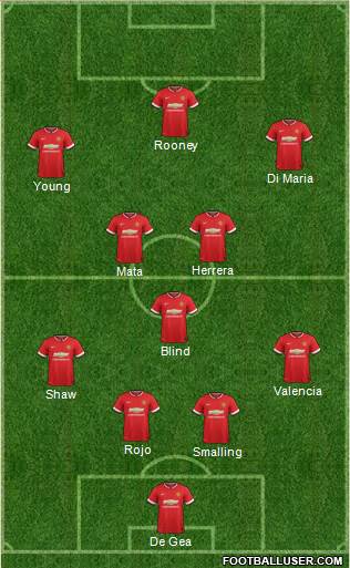 De Gea · Smalling · Rojo · Shaw · Valencia · Blind · Mata · Herrera · Young · Di Maria · Rooney