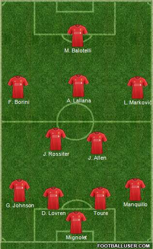 Mignolet · D. Lovren · Toure · G. Johnson · Manquillo · J. Allen · J. Rossiter · L. Marković · F. Borini · A. Lallana · M. Balotelli