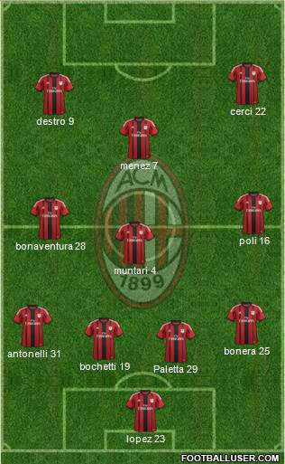 lopez 23 · Paletta 29 · bochetti 19 · antonelli 31 · bonera 25 · muntari 4 · bonaventura 28 · poli 16 · menez 7 · destro 9 · cerci 22