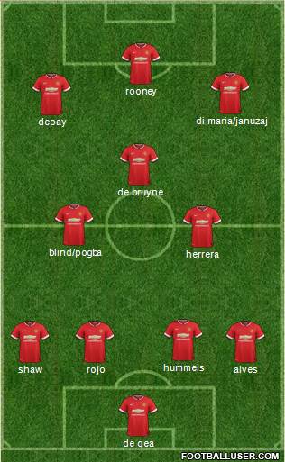 de gea · shaw · rojo · alves · hummels · herrera · blind/pogba · de bruyne · depay · di maria/januzaj · rooney