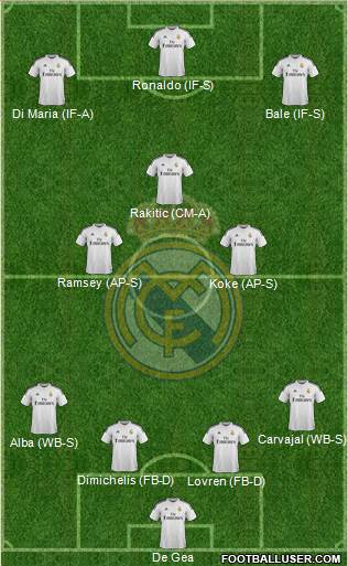 De Gea · Lovren (FB-D) · Dimichelis (FB-D) · Alba (WB-S) · Carvajal (WB-S) · Koke (AP-S) · Ramsey (AP-S) · Rakitic (CM-A) · Di Maria (IF-A) · Bale (IF-S) · Ronaldo (IF-S)