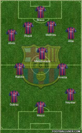 Messi · Suárez · Neymar · Iniesta · Rakitic · Mascherano · Alves · Alba · Piqué · Mathieu · Bravo