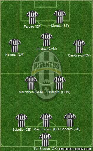 Ter Stegen (GK) · Subotic (CB) · Mascherano (CB) · Caceres (CB) · Marchisio (CDM) · Fellaini (CDM) · Candreva (RM) · Neymar (LM) · Iniesta (CAM) · Falcao (CF) · Morata (ST)NgeweMazing