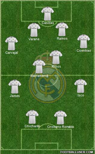 Casillas · Ramos · Varane · Coentrao · Carvajal · Kroos · Illarramendi · Isco · James · Chicharito · Cristiano Ronaldo