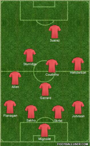 Mignolet · Skrtel · Sakho · Johnson · Flanagan · Gerrard · Allen · Coutinho · Henderson · Sturridge · Suarez
