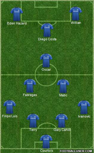 Courtois · Terry · Gary Cahill · Ivanovic · Filipe Luis · Matic · Fabregas · Oscar · Diego Costa · Eden Hazard · Willian