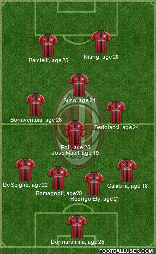 Donnarumma · age 25 · Rodrigo Ely · age 21 · Romagnoli · age:20 · Calabria · age 18 · De Sciglio · age 22 · Jose Mauri · age 19 · Poli · age 25 · Bertolacci · age 24 · Bonaventura · age 26 · Suso · age 21 · Balotelli · age 25 · Niang · age 20