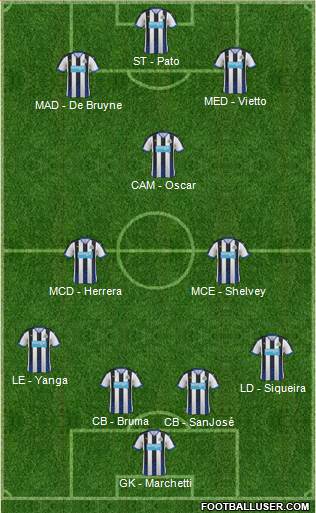 GK - Marchetti · CB - SanJosé · CB - Bruma · LD - Siqueira · LE - Yanga · MCD - Herrera · MCE - Shelvey · CAM - Oscar · MAD - De Bruyne · MED - Vietto · ST - Pato