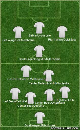 Goal Keeper/Ribosomes · Center Back/Vacuole · Center Back/Cytoplasm · Left Back/Cell Wall · Right Back/ER · Center Defensive Mid/Nucleolus · Center Defensive Mid/Nucleus · Center Attacking Mid/Mitochodria · Left Wing/Cell Membrane · Right Wing/Golgi Body · Striker/Lysosome