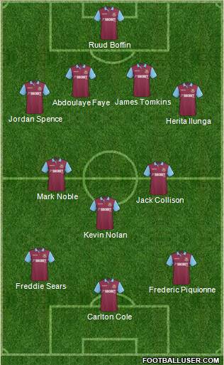 Carlton Cole · Frederic Piquionne · Freddie Sears · Kevin Nolan · Jack Collison · Mark Noble · Herita Ilunga · Jordan Spence · Abdoulaye Faye · James Tomkins · Ruud Boffin