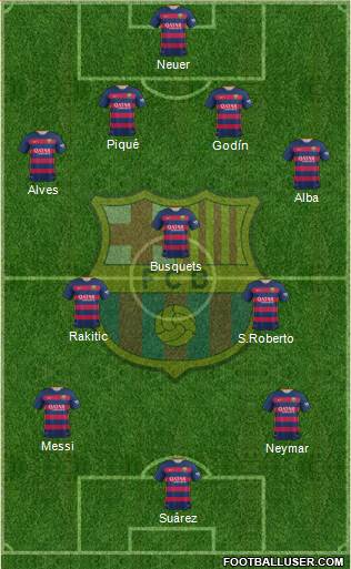 Suárez · Neymar · Messi · S.Roberto · Rakitic · Busquets · Alba · Alves · Godín · Piqué · Neuer