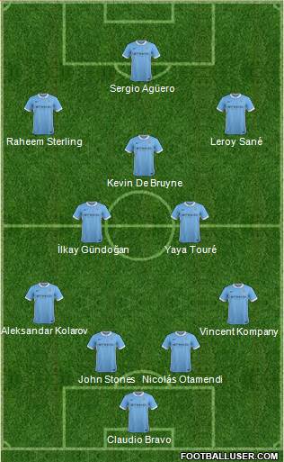 Claudio Bravo · John Stones · Nicolás Otamendi · Vincent Kompany · Aleksandar Kolarov · İlkay Gündoğan · Yaya Touré · Kevin De Bruyne · Raheem Sterling · Leroy Sané · Sergio Agüero
