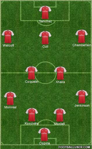 Ospina · Mustafi · Koscielny · Monreal · Jenkinson · Xhaka · Coquelin · Ozil · Walcott · Chamberlain · Sanchez