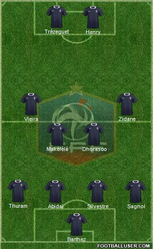 Barthez · Abidal · Silvestre · Sagnol · Thuram · Makélélé · Dhorasoo · Vieira · Zidane · Henry · Trézeguet