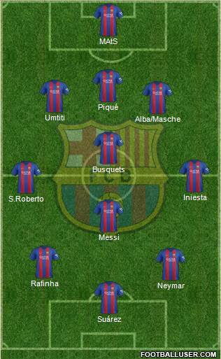 Suárez · Neymar · Rafinha · Messi · S.Roberto · Iniesta · Busquets · Alba/Masche · Umtiti · Piqué · MAtS