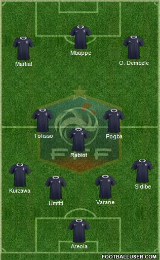 Areola · Umtiti · Varane · Kurzawa · Sidibe · Rabiot · Pogba · Tolisso · Martial · O. Dembele · Mbappe