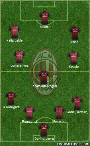 Donnarumma · Romagnoli · Musachio · Conti(Darmian) · R.rodriguez · locatelli(fabregas) · Kessie · bonaventura · Suso · keita balde · Belotti9