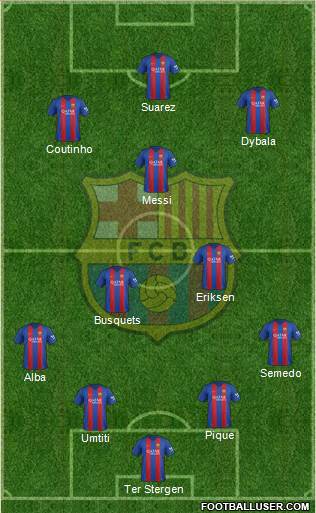 Ter Stergen · Umtiti · Pique · Alba · Semedo · Busquets · Eriksen · Messi · Coutinho · Dybala · Suarez