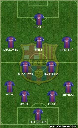 TER STEGEN · UMTITI · PIQUÉ · SEMEDO · ALBA · BUSQUETS · PAULINHO · DEMBÉLÉ · DEULOFEU · MESSI · SUAREZ