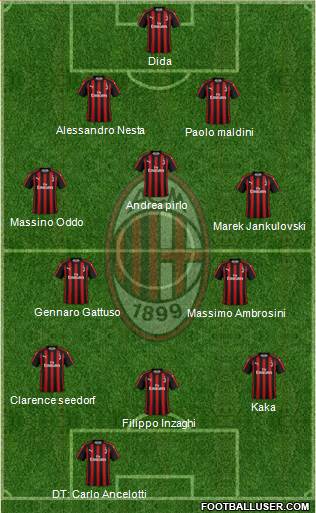 DT: Carlo Ancelotti · Filippo Inzaghi · Kaka · Clarence seedorf · Massimo Ambrosini · Gennaro Gattuso · Marek Jankulovski · Massino Oddo · Andrea pirlo · Paolo maldini · Alessandro Nesta · Didapor la cantidad de torneos