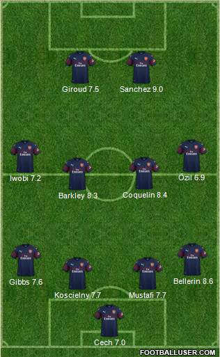 Cech 7.0 · Koscielny 7.7 · Mustafi 7.7 · Gibbs 7.6 · Bellerin 8.6 · Barkley 8.3 · Coquelin 8.4 · Iwobi 7.2 · Özil 6.9 · Giroud 7.5 · Sanchez 9.0