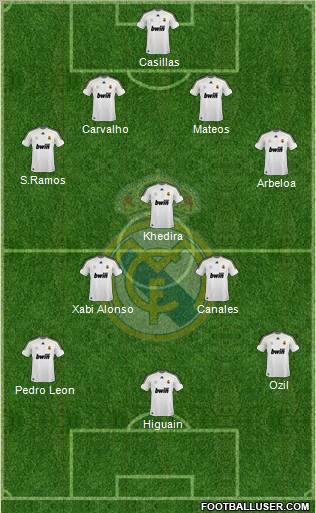 Higuain · Pedro Leon · Ozil · Xabi Alonso · Canales · Khedira · Arbeloa · S.Ramos · Carvalho · Mateos · CasillasHay muchas lesiones en el equipo...y creo que lo ideal es que Mou apueste por esa formacion y que tire de la cantera que para eso esta,para que suban jugadores al primer equipo.