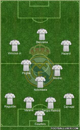 Courtois · Sergio Ramos · Varane · Carvajal · Reguilón · Ndombele · Modric · Pogba · Hazard · Vinicius Jr. · Benzema