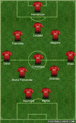 Rashford · Martial · Bruno Fernandez · Andreas · Tielemans · Shaw · Dalot · Tuanzebe · Maguire · Lindelof · Henderson