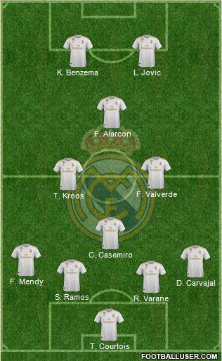 T. Courtois · R. Varane · S. Ramos · D. Carvajal · F. Mendy · C. Casemiro · T. Kroos · F. Valverde · F. Alarcon · K. Benzema · L. JovicThis is the formation Zidane uses when he trusts Isco the most, and currently Isco is his best player. I don't think that Manchester City will have a lot of advantage in possession at the Bernabeu, so possession will be even, and that way Real Madrid will be able to play this way without parking the bus nor trying to much counter attacks (at least in the first half). Besides, this is an unlikely formation especially when adding Luka Jovic to the equation, which is exactly what is needed right now in Madrid and the surprise effect will be useful.