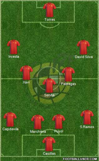 Casillas · Marchena · Puyol · Capdevila · S.Ramos · Senna · Fabregas · Xavi · David Silva · Iniesta · Torres