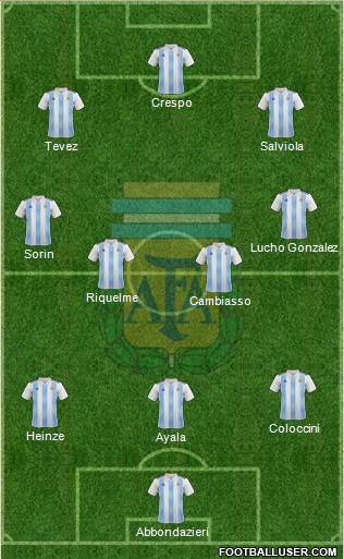 Abbondazieri · Ayala · Heinze · Coloccini · Cambiasso · Riquelme · Sorin · Lucho Gonzalez · Tevez · Salviola · CrespoLa selección argentina que cayó injustamente ante alemania en 2006.