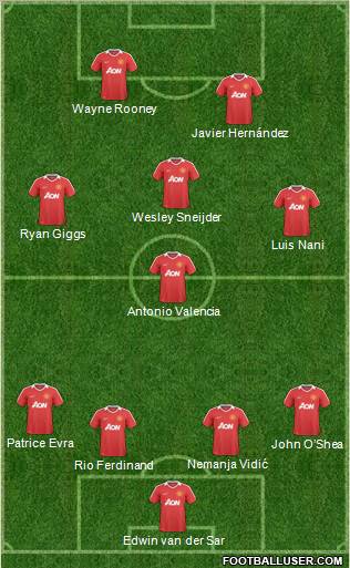 Edwin van der Sar · Rio Ferdinand · Nemanja Vidić · John O’Shea · Patrice Evra · Antonio Valencia · Luis Nani · Ryan Giggs · Wesley Sneijder · Javier Hernández · Wayne Rooney