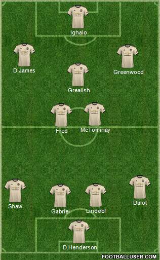 D.Henderson · Gabriel · Lindelöf · Shaw · Dalot · Fred · McTominay · Grealish · Greenwood · D.James · Ighalo