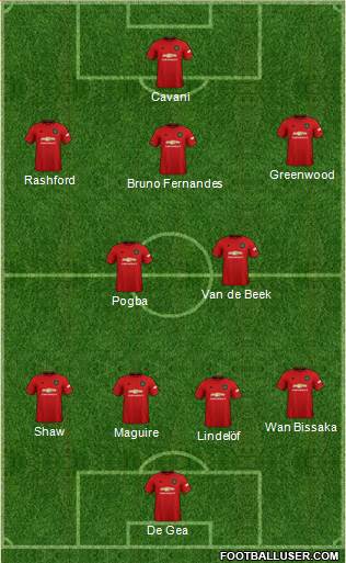 De Gea · Lindelöf · Maguire · Shaw · Wan Bissaka · Pogba · Van de Beek · Bruno Fernandes · Rashford · Greenwood · Cavani